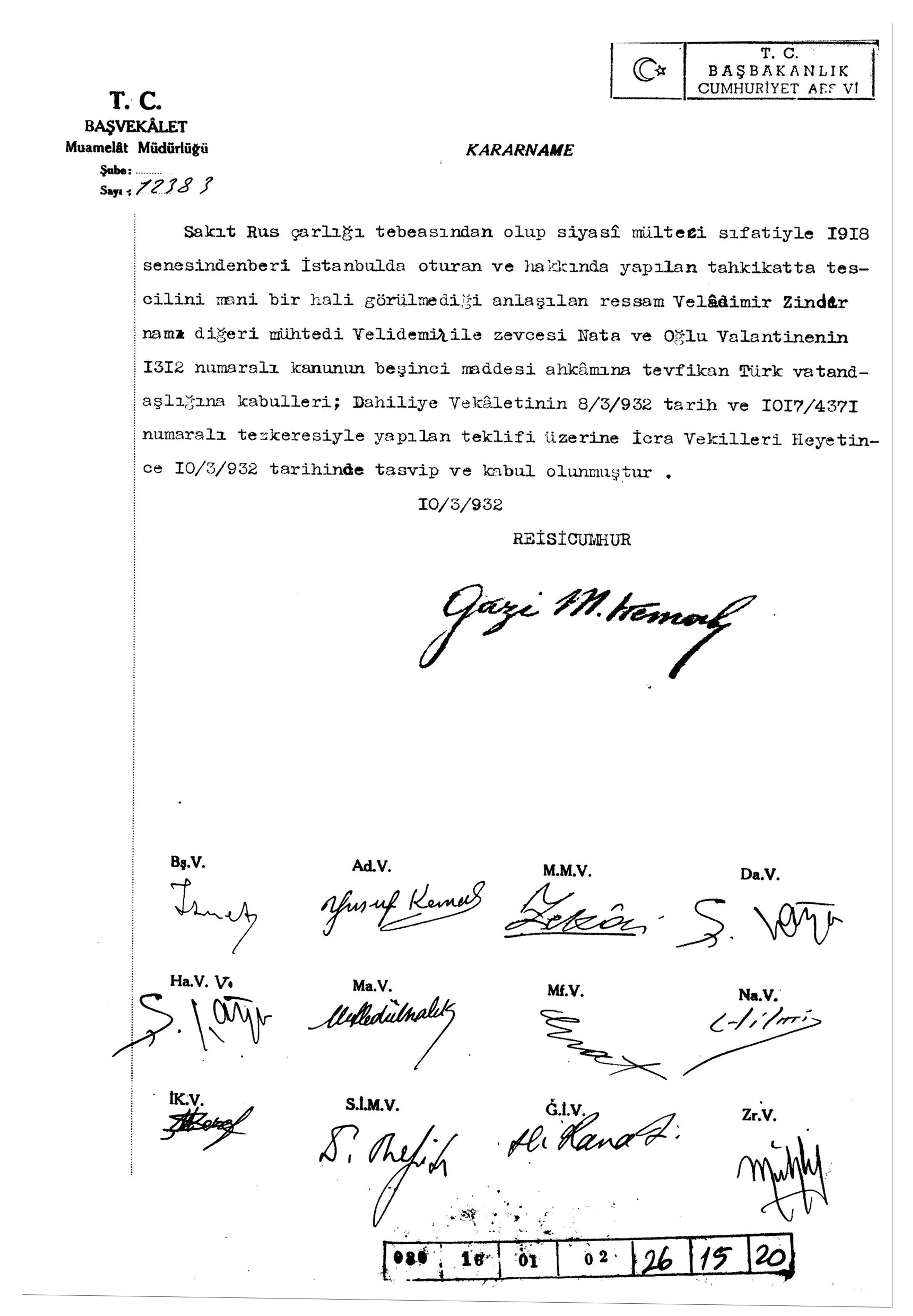 Vladimir Zender ve ailesinin Türk vatandaşlığına kabul belgesi, 10 Mart 1932