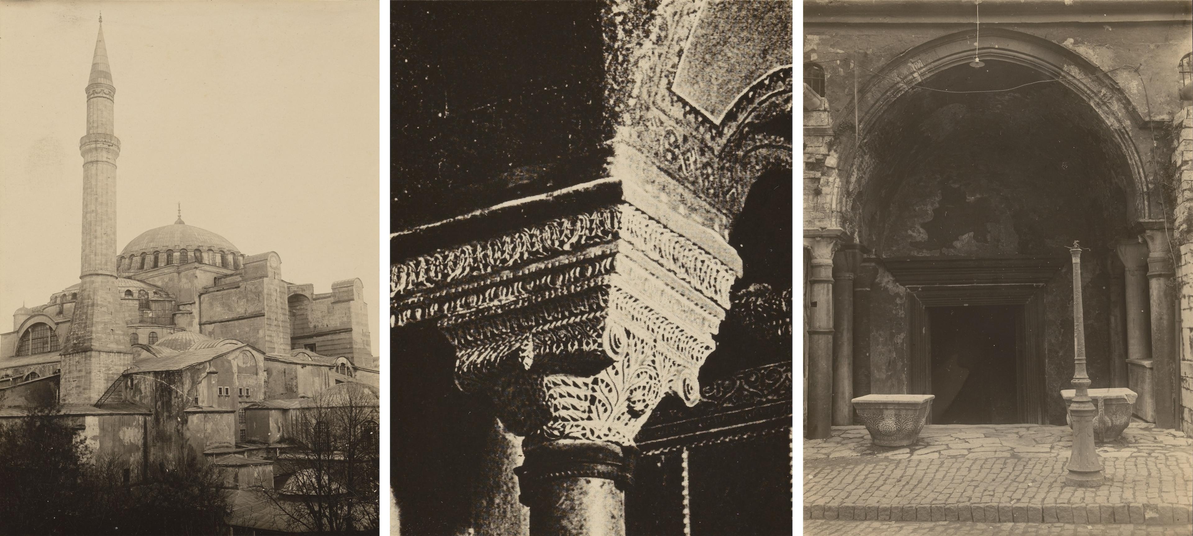 Soldan sağa: Ayasofya’nın kuzeybatıdan görünümü; Bizans dönemi sütun başlığı; girişteki sütunlar, Byzantina: Important Antiquities of Constantinople, Constantinople: [s.n.], 1925–1930, No. 1