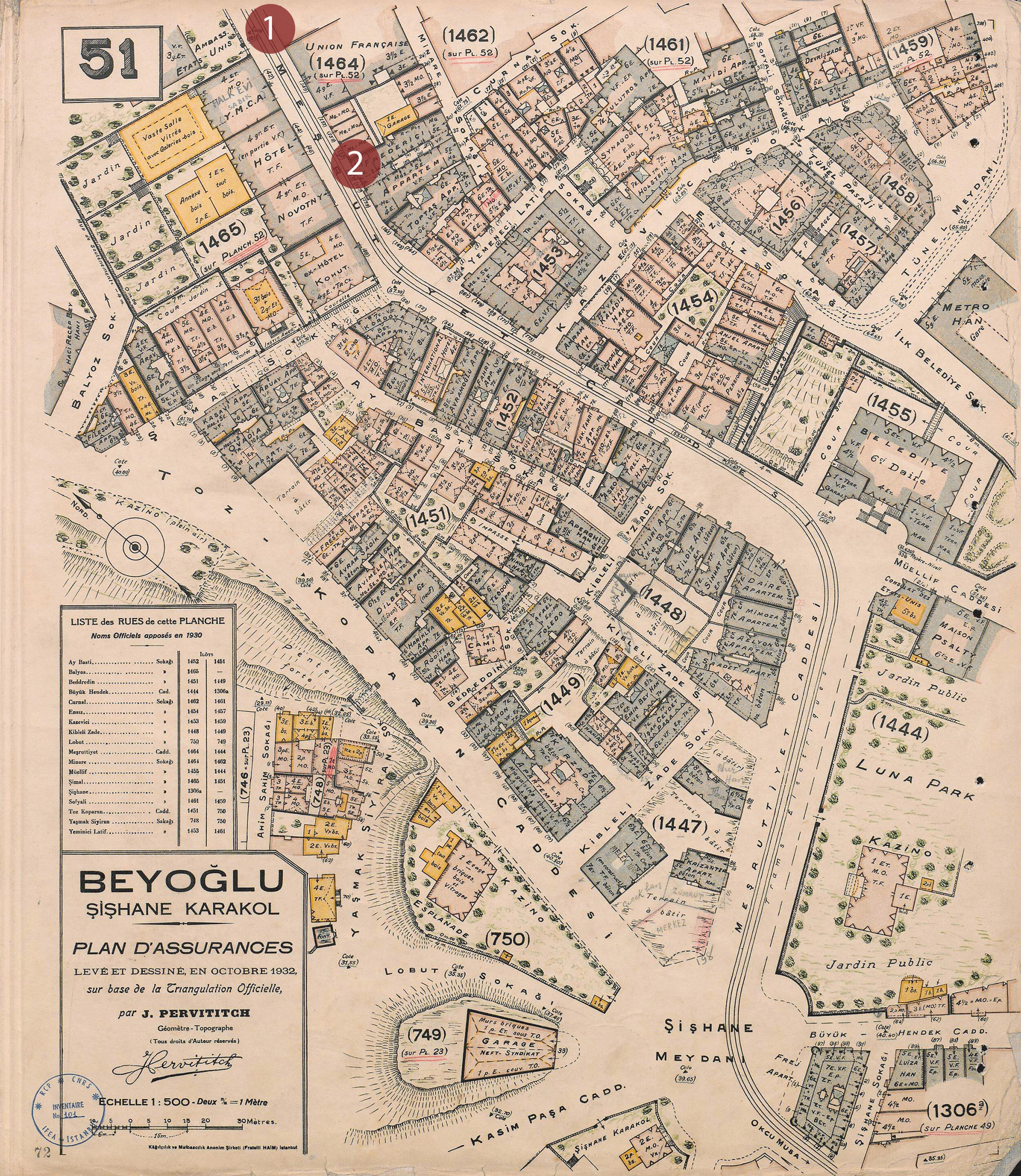 Jacques Pervititch tarafından hazırlanan, 1932 tarihli Beyoğlu No: 51 haritasında Foto Sender’in Kabristan Caddesi No: 147’deki ve Frederici Pasajı No:155’teki konumu